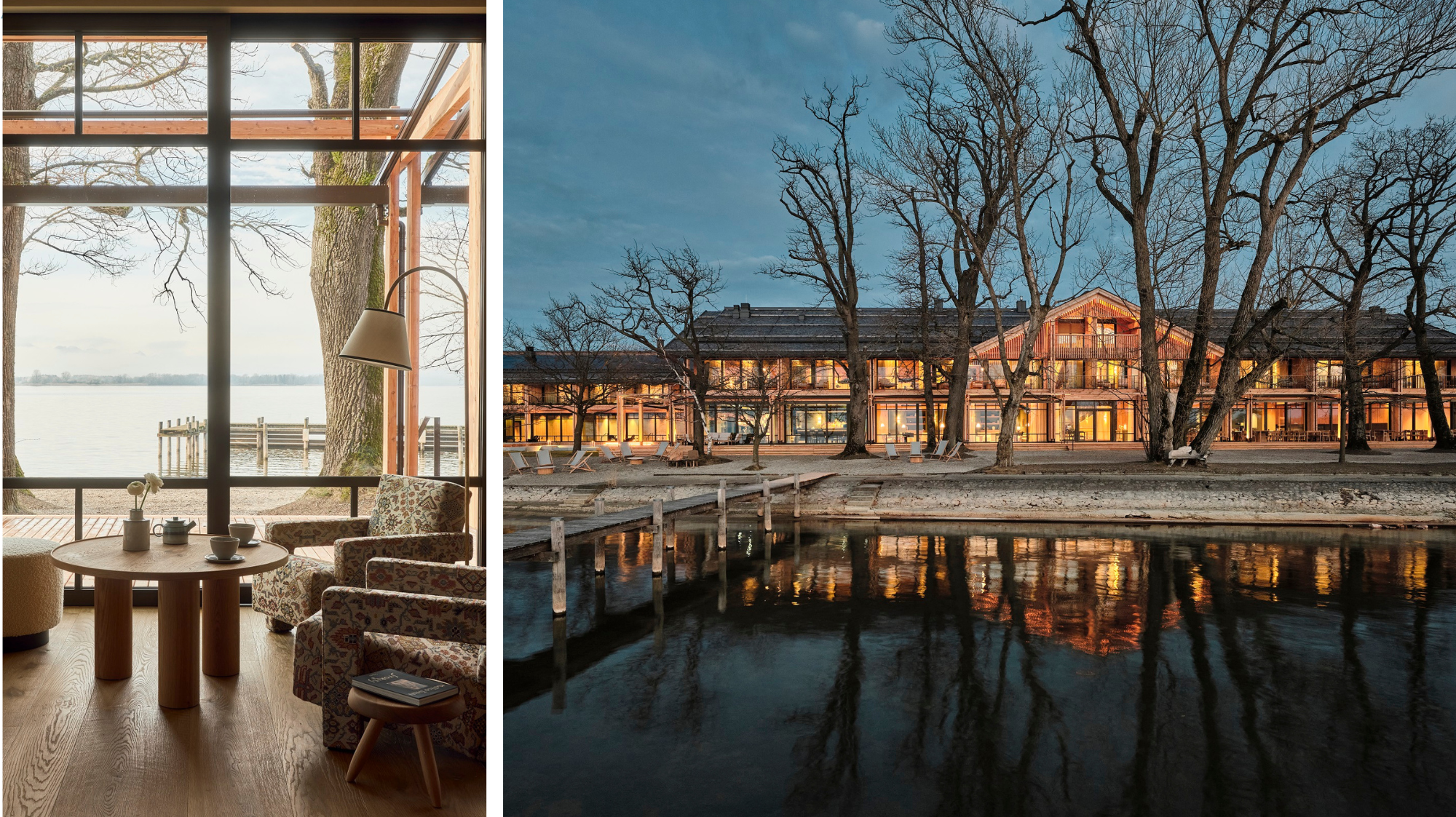 Inspiriert von traditionellen, bayerischen "Holzstadln" hat der Architekt das Retreat in drei Baukörper gegliedert, die sich harmonisch in die Landschaft einfügen. "Gefertigt wurden sie überwiegend aus heimischer Lärche und Fichte, ergänzt durch Naturstein, Glas und Marmor.", liest man auf der Landingpage von Schotten & Hansen. Immer wieder wird der Blick in die Natur freigegeben und gekonnt eine "organische Verbindung von Außen und Innen" geschaffen: Dies durch "große Fensterflächen, Pergolen und gläserne Übergänge. Durch übergroße Fensterfronten sowie umlaufende Holz-Terrassen verschmilzt das Haus mit dem See." By the way: Es gibt 28 Suiten, die allesamt zum Wasser ausgerichtet sind. "Mit den wohl schönsten Sonnenuntergängen" - erfährt man auf der Homepage des Hideaways.